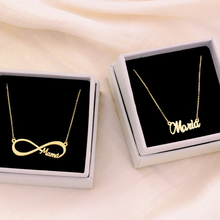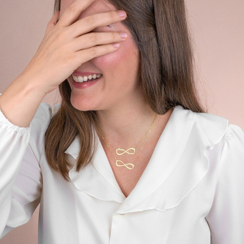 Our 750 yellow gold name chain with infinity sign pendant is timeless and elegant. Personalize this unique piece of jewelry with your name or that of a loved one. Show your commitment and style with this high-quality name chain.
