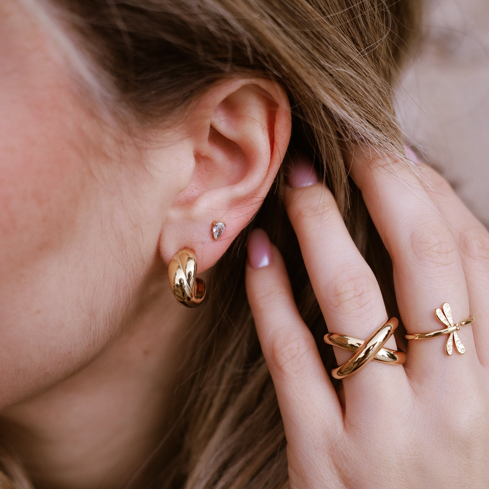 Die Wave Ohrstecker fangen Bewegung ein – weich geschwungen wie Wellen im Licht. Ihre skulpturale Form wirkt modern und sinnlich zugleich, egal ob in warmem Gold oder kühlem Silber. Schmuck, der Leichtigkeit trägt – und bleibt.