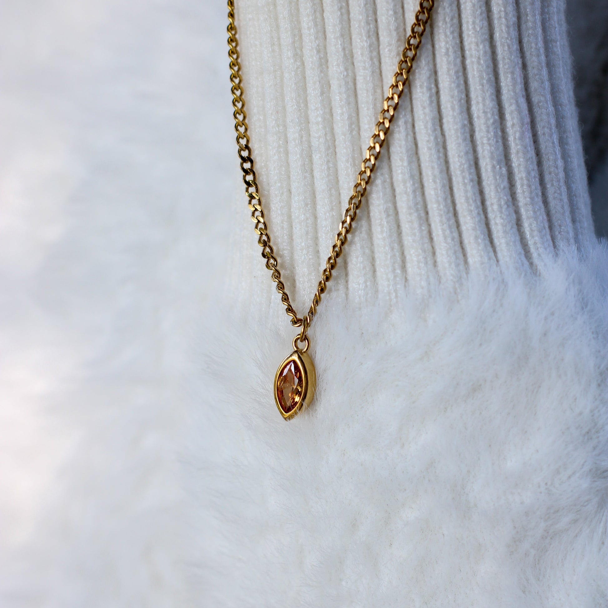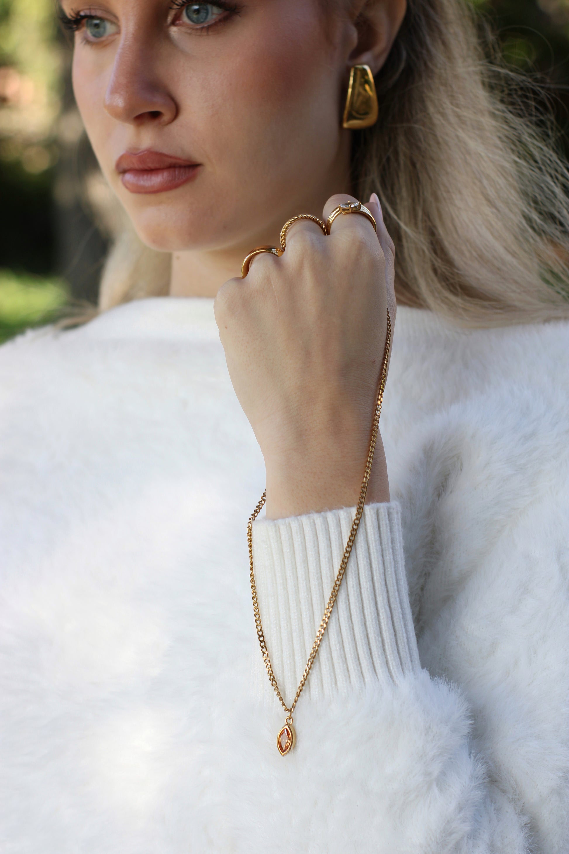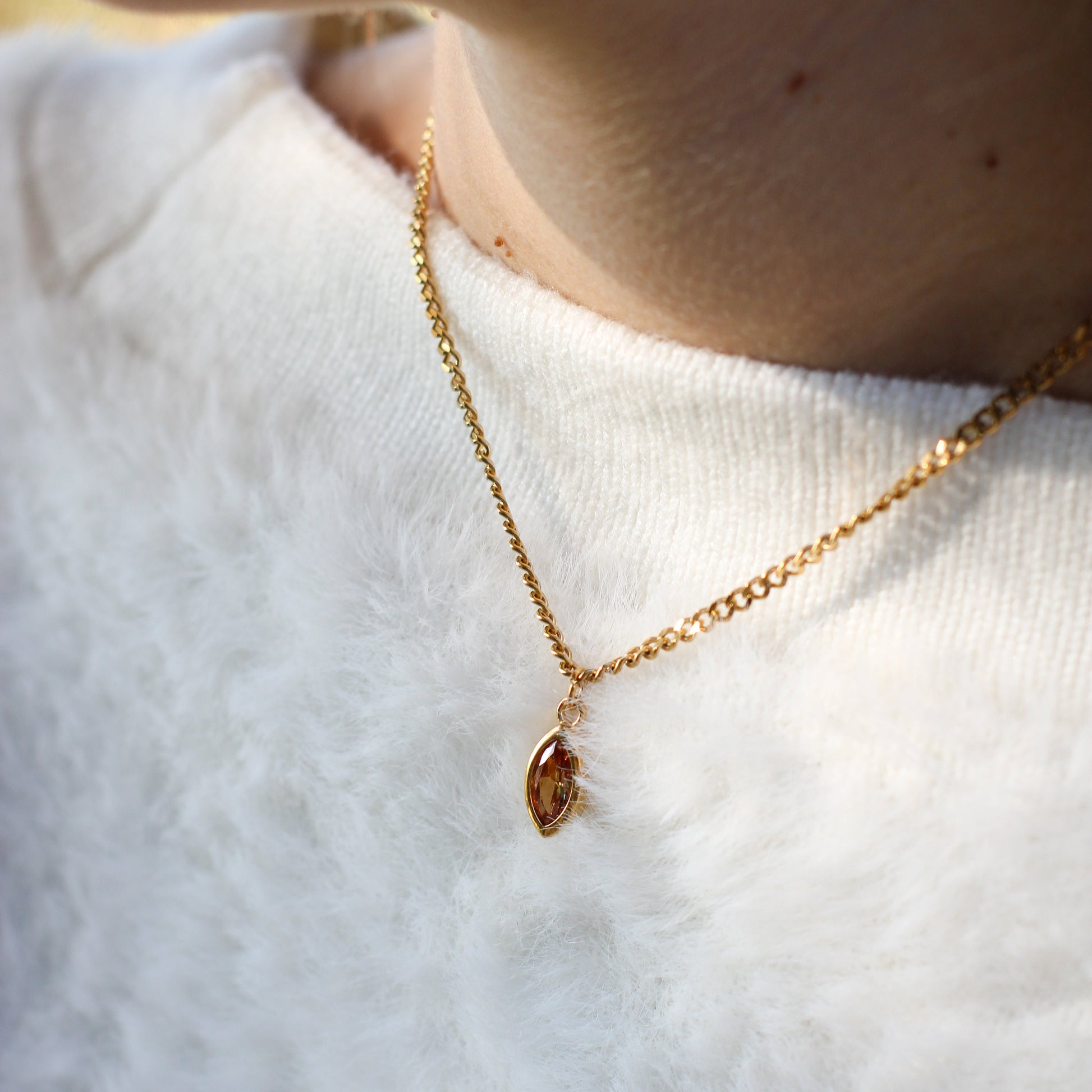 Die „CHAMPAGNE“-Halskette vereint Eleganz und Langlebigkeit in einem exquisiten Design. Diese vergoldete Kette wird durch einen champagnerfarbenen Stein in Marquise-Form veredelt, der eine warme und luxuriöse Ausstrahlung besitzt. Dank der PVD-Plattierung ist die Kette nicht nur stilvoll, sondern auch wasserfest, sodass sie ihre Schönheit und ihren Glanz über lange Zeit hinweg behält. Mit einer Länge von 41 cm und einer zusätzlichen Verlängerung von 5 cm passt sie sich perfekt an verschiedene Outfits und Gelegenheiten an. Der elegante Anhänger misst 17 mm in der Länge und 7,5 mm in der Breite und fügt dem Schmuckstück eine edle Note hinzu.