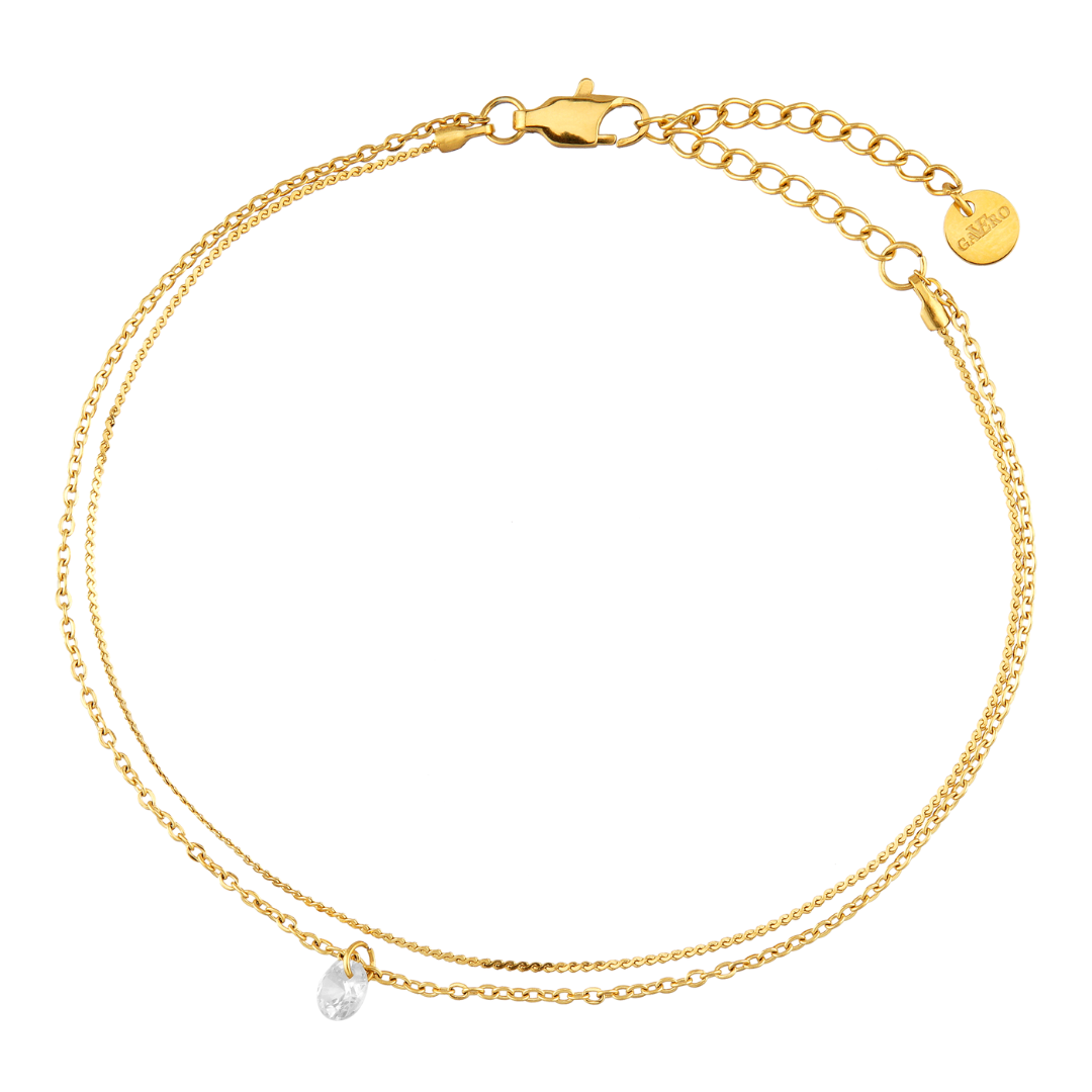 Super schönes mit einem funkelnden Zirkoniastein verziertes, doppelreihiges Fußkettchen, mit dem du an Land und im Wasser glänzen kannst. Du brauchst es beim Schwimmen nicht abzunehmen, da es es Edelstahl und einer hochwertigen 18 K Vergoldung besteht.