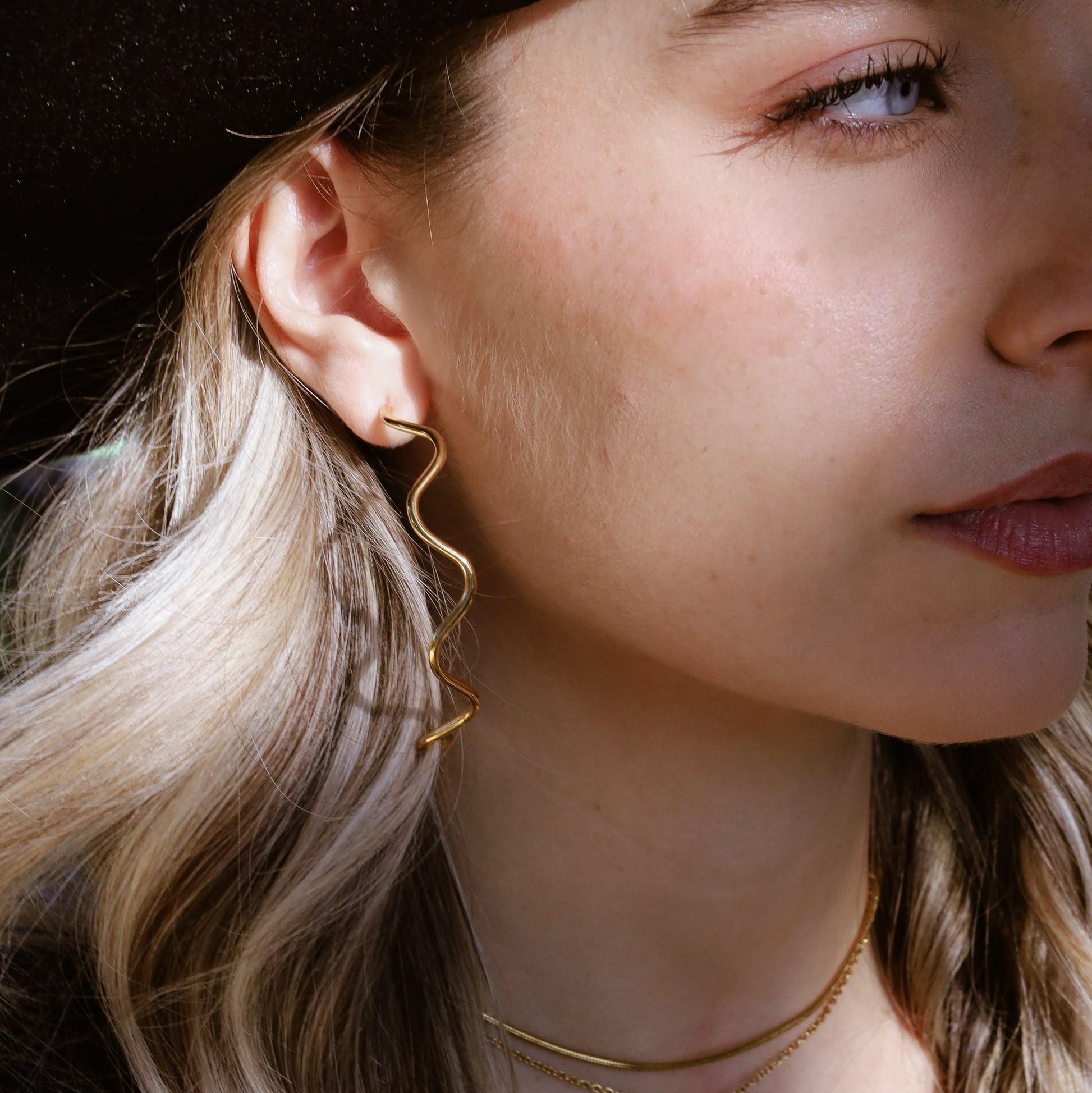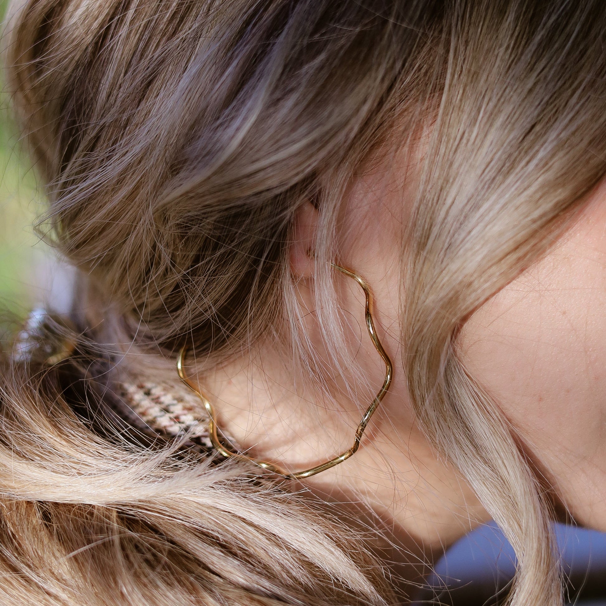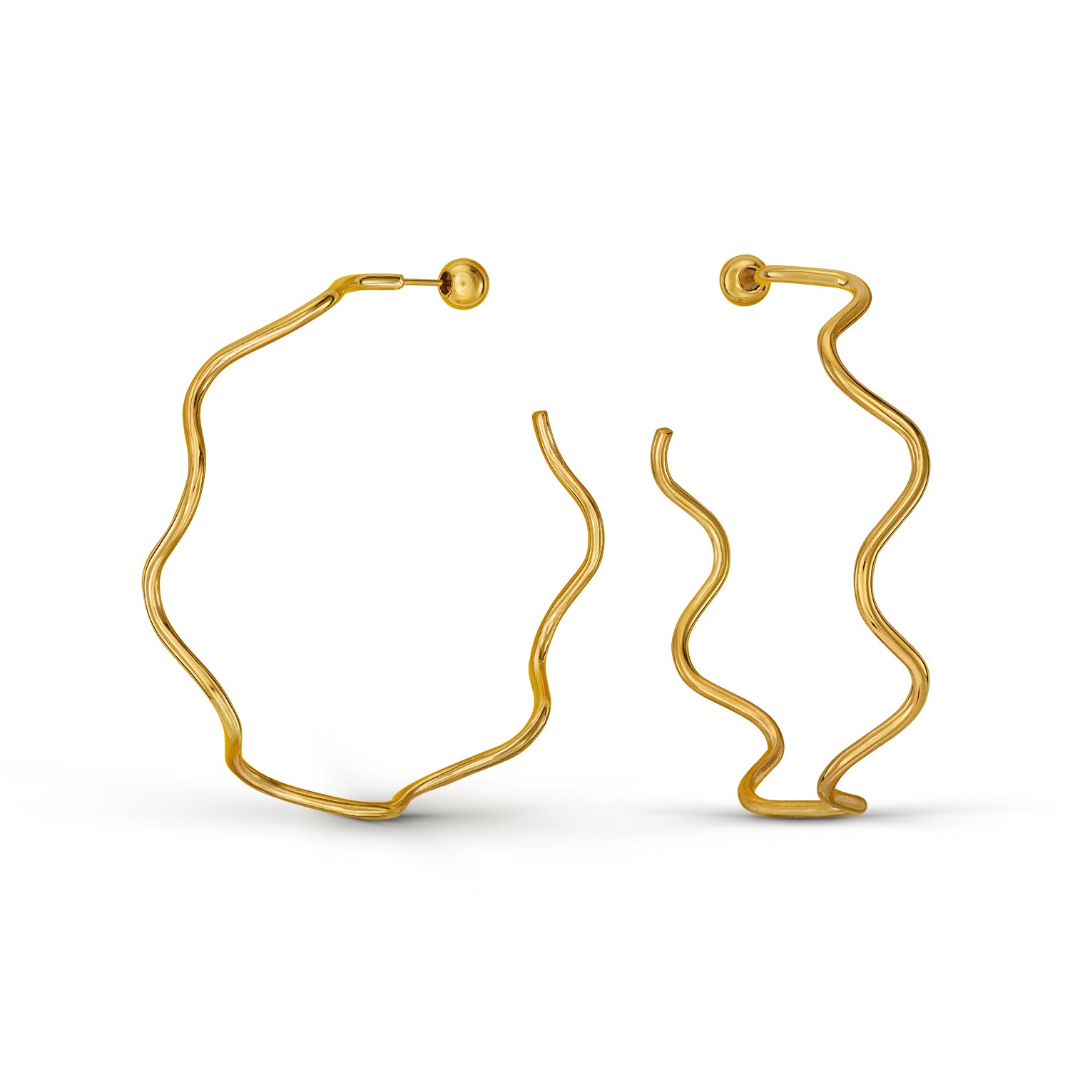 Die Onda Kreolen bringen Bewegung und Eleganz in jeden Look. Ihr wellenförmiges Design erinnert an fließende Linien – modern, klar und zeitlos. Gefertigt aus wasserfestem Edelstahl mit 18k Vergoldung begleiten sie dich im Alltag ebenso zuverlässig wie auf Reisen oder beim Ausgehen.