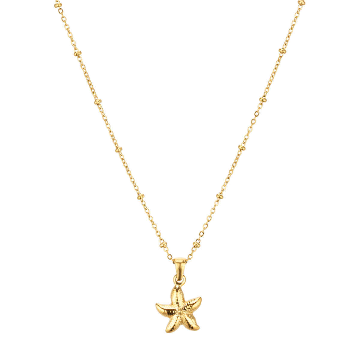 Entdecke die stilvolle Eleganz der Stella Dorata Halskette aus unserer exklusiven Oceans Whisper Kollektion. Diese einzigartige Halskette besticht durch ihren coolen, goldfarbenen Seestern-Anhänger, der perfekt die Schönheit und Mystik des Meeres einfängt. Mit einer Länge von 41 cm, plus einer zusätzlichen Verlängerung von 5 cm, bietet diese Halskette die ideale Passform für jede Trägerin.