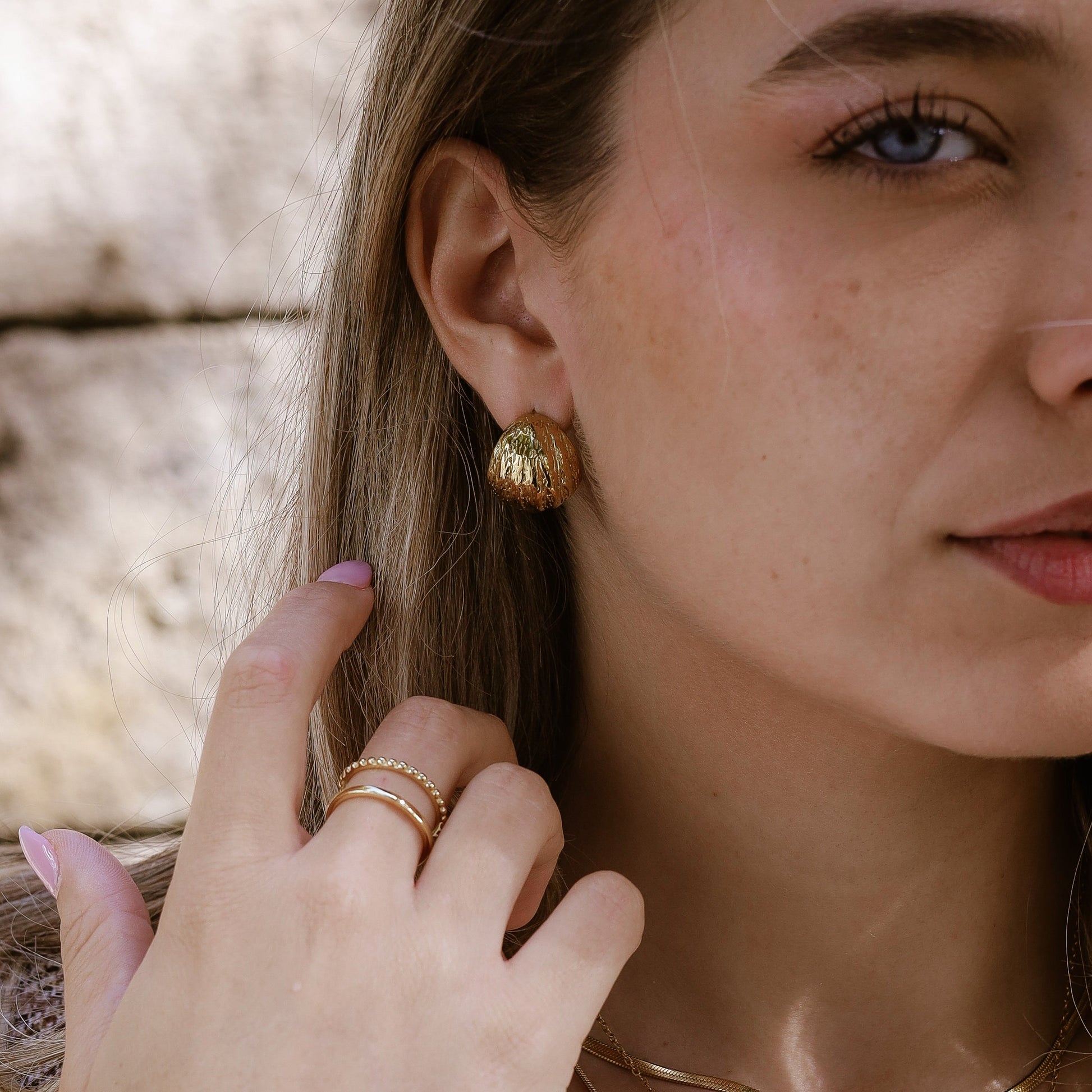 Wie das Spiel der Gezeiten – kraftvoll, organisch und voller Leichtigkeit. Die Tide Ohrringe vereinen Struktur und Glanz zu einem Design, das wirkt wie vom Meer geformt: modern, selbstbewusst, sommerlich.